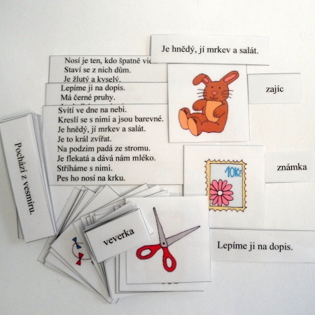Úkolem je přečíst si větu a přiřadit ji ke správném obrázku. Podle textu na velkých kartách mohou děti přiřazovat názvy předmětů k obrázkům.