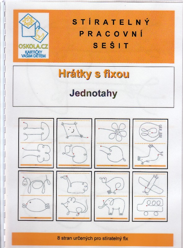 Stíratelný pracovní sešit s plastovou vazbou obsahuje 8 stíratelných stránek. Tento sešit umožňuje první průpravu ke psaní. Obtahování obrázků jedním tahem pomáhá při uvolňování zápěstí.