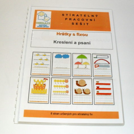 Stíratelný pracovní sešit s plastovou vazbou obsahuje 8 stíratelných stránek. Tento sešit umožňuje první průpravu ke psaní. Obtahování obrázků jedním tahem pomáhá při uvolňování zápěstí.