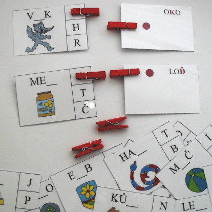 Každá sada obsahuje 24 kartiček. Na kartičce je obrázek a neúplné slovo. Děti mají za úkol vybrat správnou odpověď k doplnění slova a na tuto odpověď umístit kolíček. Po otočení kartičky si mohou svoji odpověď zkontrolovat.