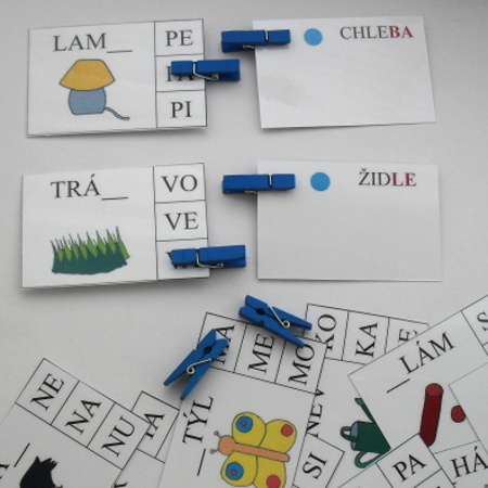 Každá sada obsahuje 24 kartiček. Na kartičce je obrázek a neúplné slovo. Děti mají za úkol vybrat správnou odpověď k doplnění slova a na tuto odpověď umístit kolíček. Po otočení kartičky si mohou svoji odpověď zkontrolovat.