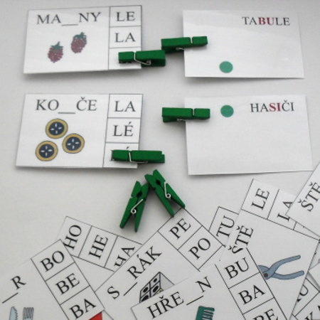 Každá sada obsahuje 24 kartiček. Na kartičce je obrázek a neúplné slovo. Děti mají za úkol vybrat správnou odpověď k doplnění slova a na tuto odpověď umístit kolíček. Po otočení kartičky si mohou svoji odpověď zkontrolovat.