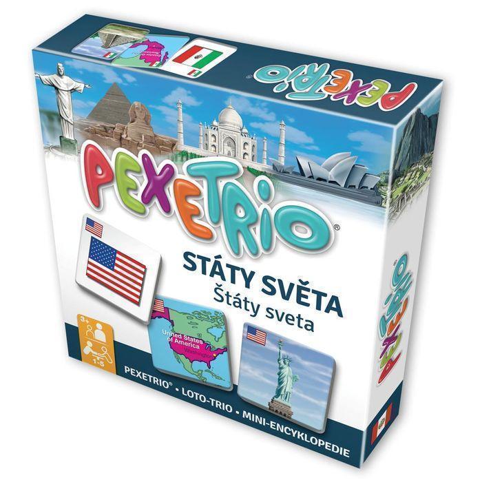 Pexetrio STÁTY SVĚTA je didaktická a zábavná hra, ve které se naučíte poznat vlajky, mapky a stavební památky stejného státu.