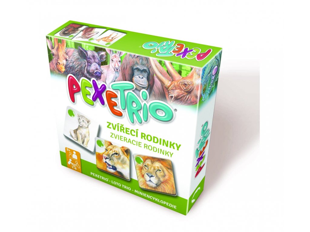 Pexetrio ZVÍŘECÍ RODINKY je zábavná hra inspirovaná pexesem, která děti zároveň i vzdělává. Děti se naučí poznávat různé živočichy, samce, samice a jejich mláďata podle hesla „škola hrou“. Kromě toho, že si děti osvojí živočichy zábavným způsobem, hra také napomáhá rozvíjet jejich logické myšlení a trénovat paměť hledáním trojice kartiček s roztomilými zvířecími rodinkami.